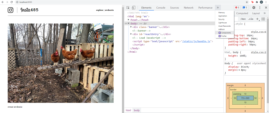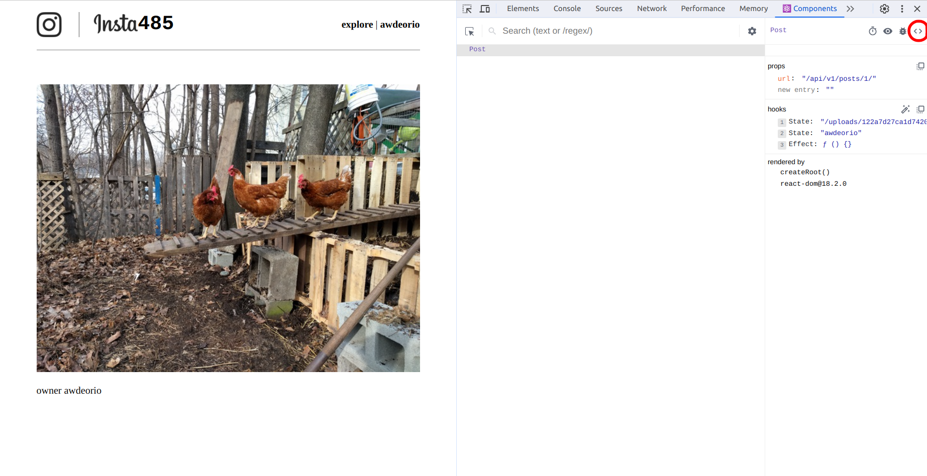 Open up the browser’s developer tools, click on the arrow to see more tabs, and click on the Components tab, and click on the Post component. You should see the Post component with its props and hooks. You can also inspect the matching DOM element by clicking on the eye icon. As you can see, the state of owner is awdeorio as expected, so most likely the bug is introduced when the component is being rendered.