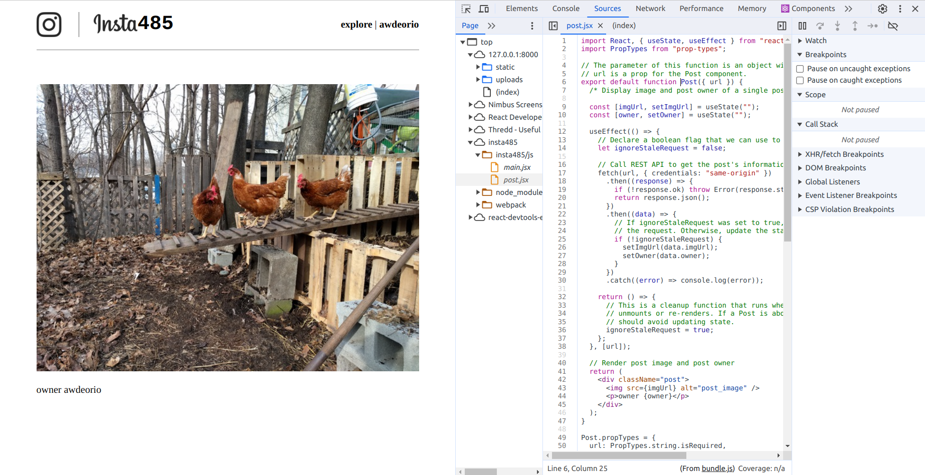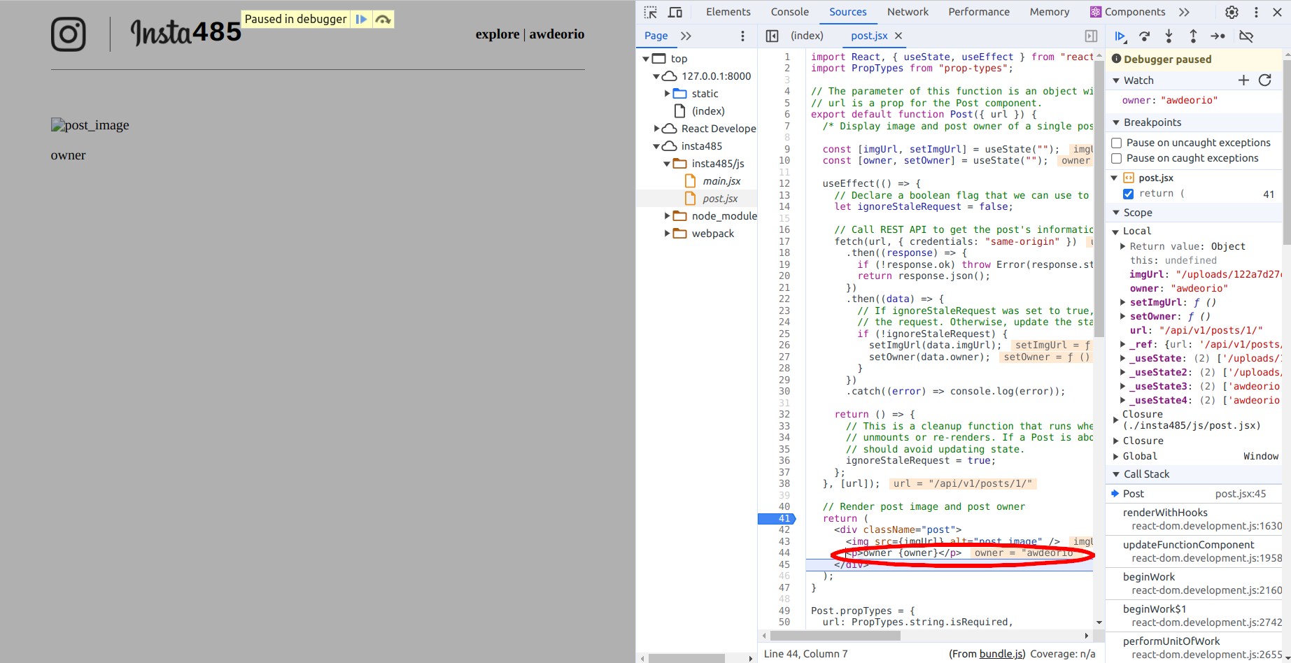 Since we are using the local variable owner to display the owner of the post, the bug most likely involves owner. As you step through the lines of code, you should notice that you are rendering the string "owner " and the variable owner instead of just the variable owner. This is why owner appeared on the screen before the state was updated with awdeorio. You have now caught your bug!