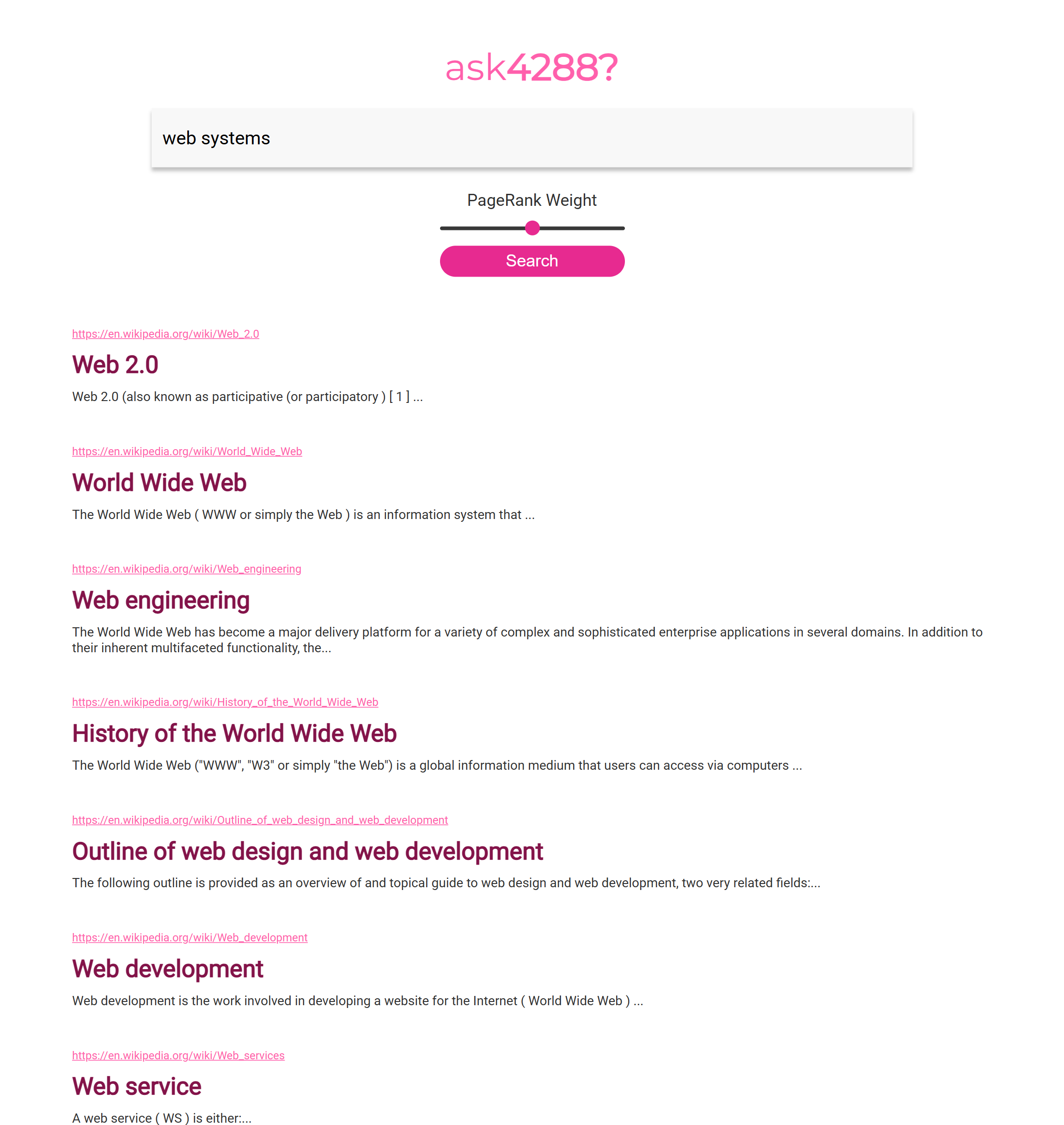 When you’re done, you’ll have a working search engine that looks like this:
